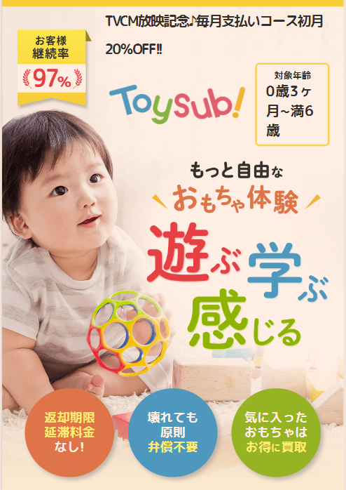 トイサブは、只今初月20%OFFの2,939円(税込)で利用できるので、買うと高価な知育玩具のレンタルをしてみませんか?